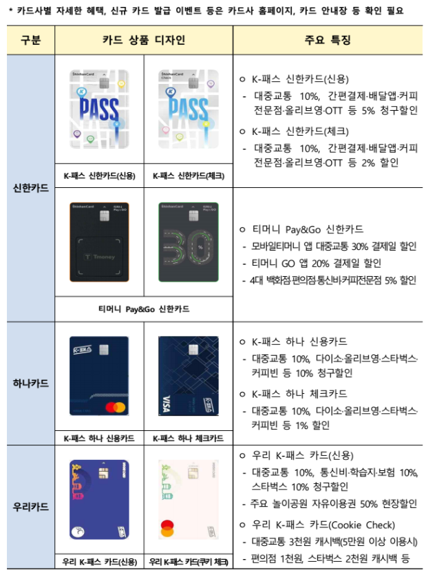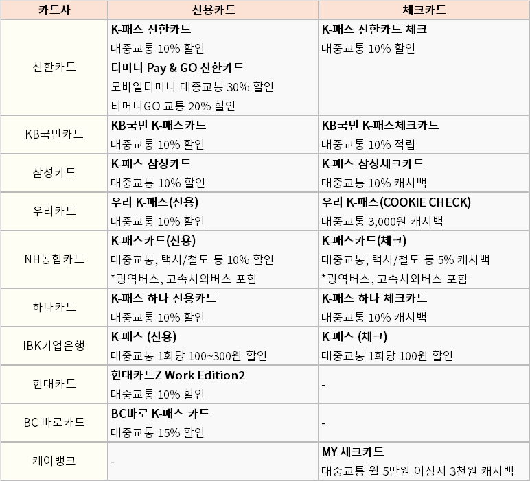 K패스 체크카드는 카드 발급사에 따라 다양한 종류가 있습니다. 각 카드마다 혜택과 사용 범위가 다르므로, 자신에게 적합한 카드를 선택하는 것이 중요합니다. 대표적인 K패스 체크카드를 비교하여 그 특징을 살펴보겠습니다.
